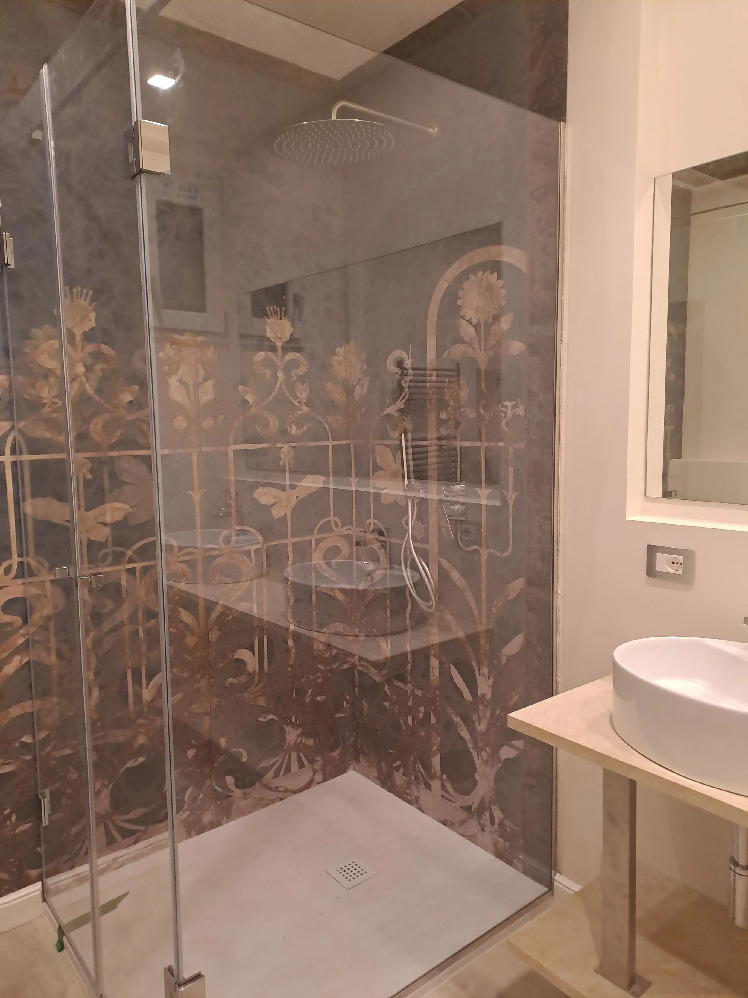 Bathroom n.2: in front of the master bed-room and living-room, 2 sinks, WC, bidet and maxi shower with artistic wall-paper.