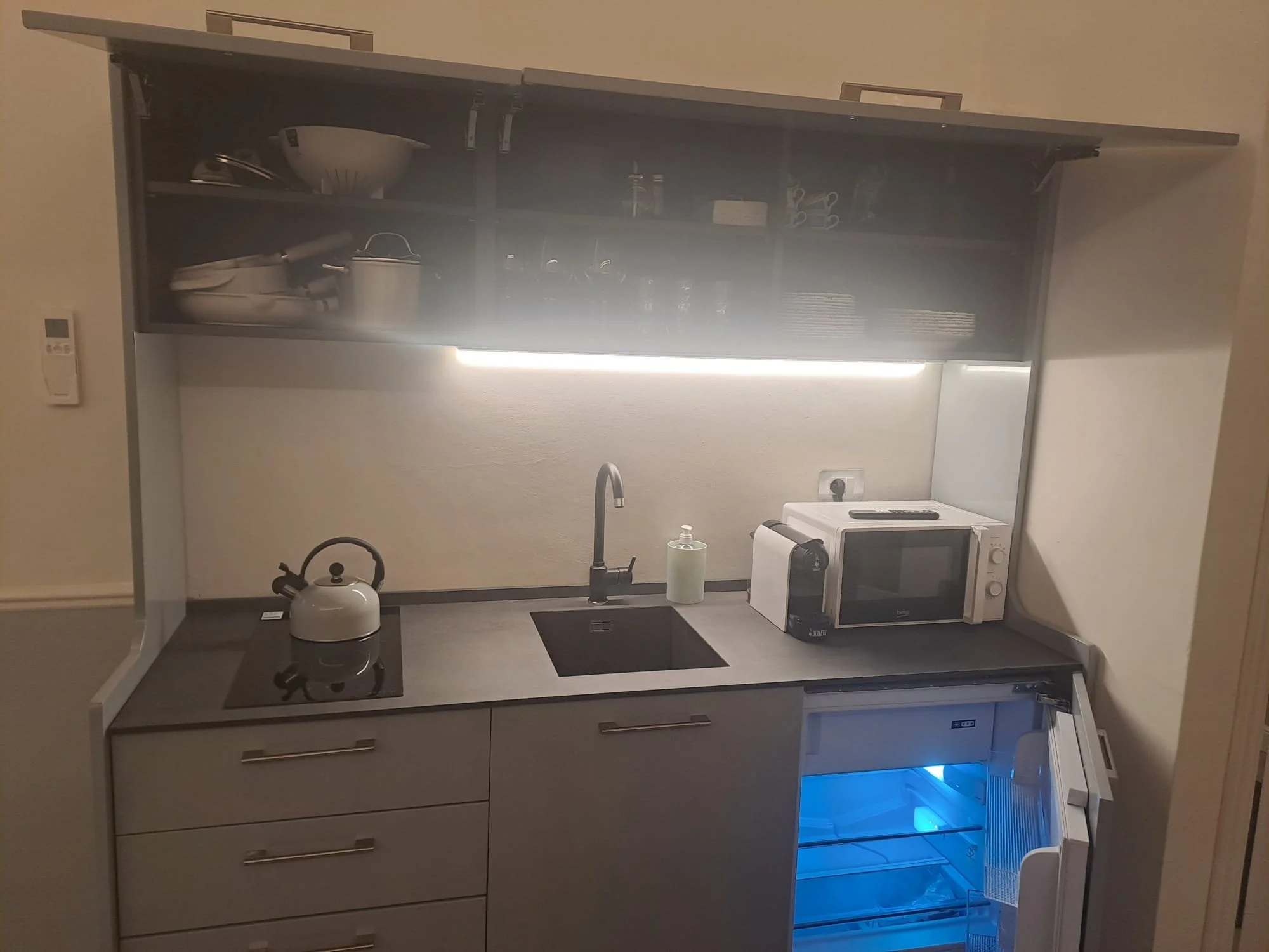The kitchen is fully equipped and has a double induction stove, fridge with a designed and modern sink.